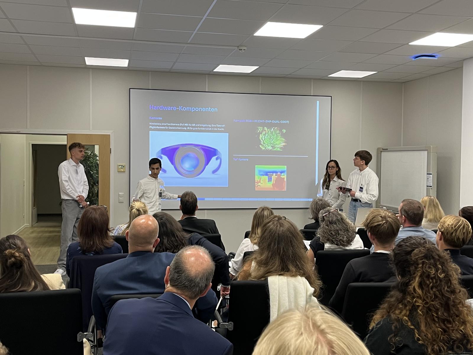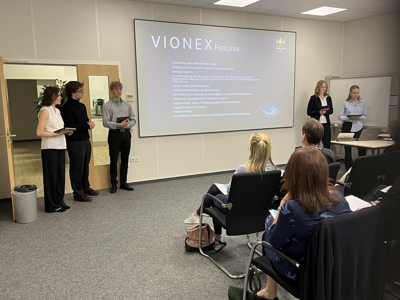 „Ganz nebenbei“ musste aber von allen drei Unternehmensvorständen auch noch eine Smart-Brille 3.0 entwickelt werden, denn der Großversender „Amazonda“ winkte mit einem Sonderauftrag für 1.500.000 Geräte, wenn man ein besonders ansprechendes Modell vorlegen würde und bei einer Präsentation in der Mitte der Woche überzeugend anpreisen könnte. Ein Fachpublikum, bestehend aus Vertreter:innen der Lüneburger Wirtschaft, simulierte die Einkaufsabteilung der Firma Amazonda und stellte den drei Unternehmensvorständen knifflige Fragen rund um das neu entwickelte Produkt.